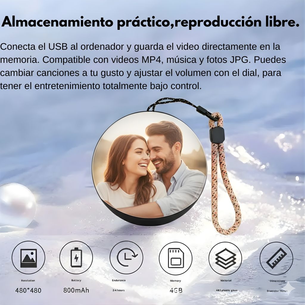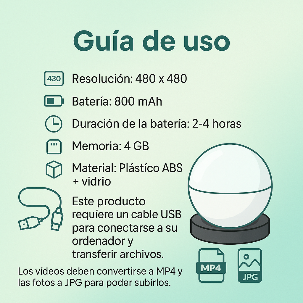 - Fácil conexión USB para cargar tus propios recuerdos (formatos MP4 y JPG).