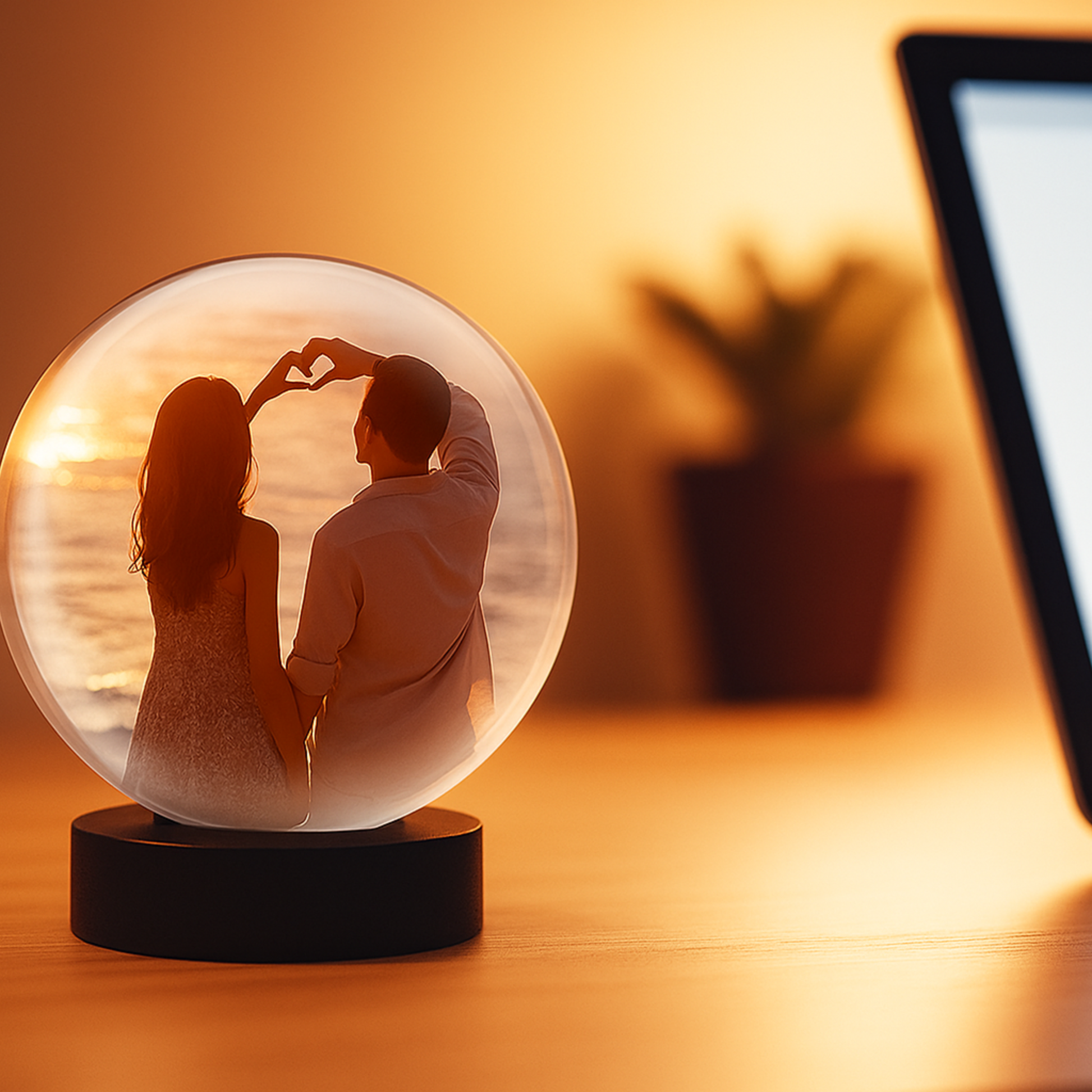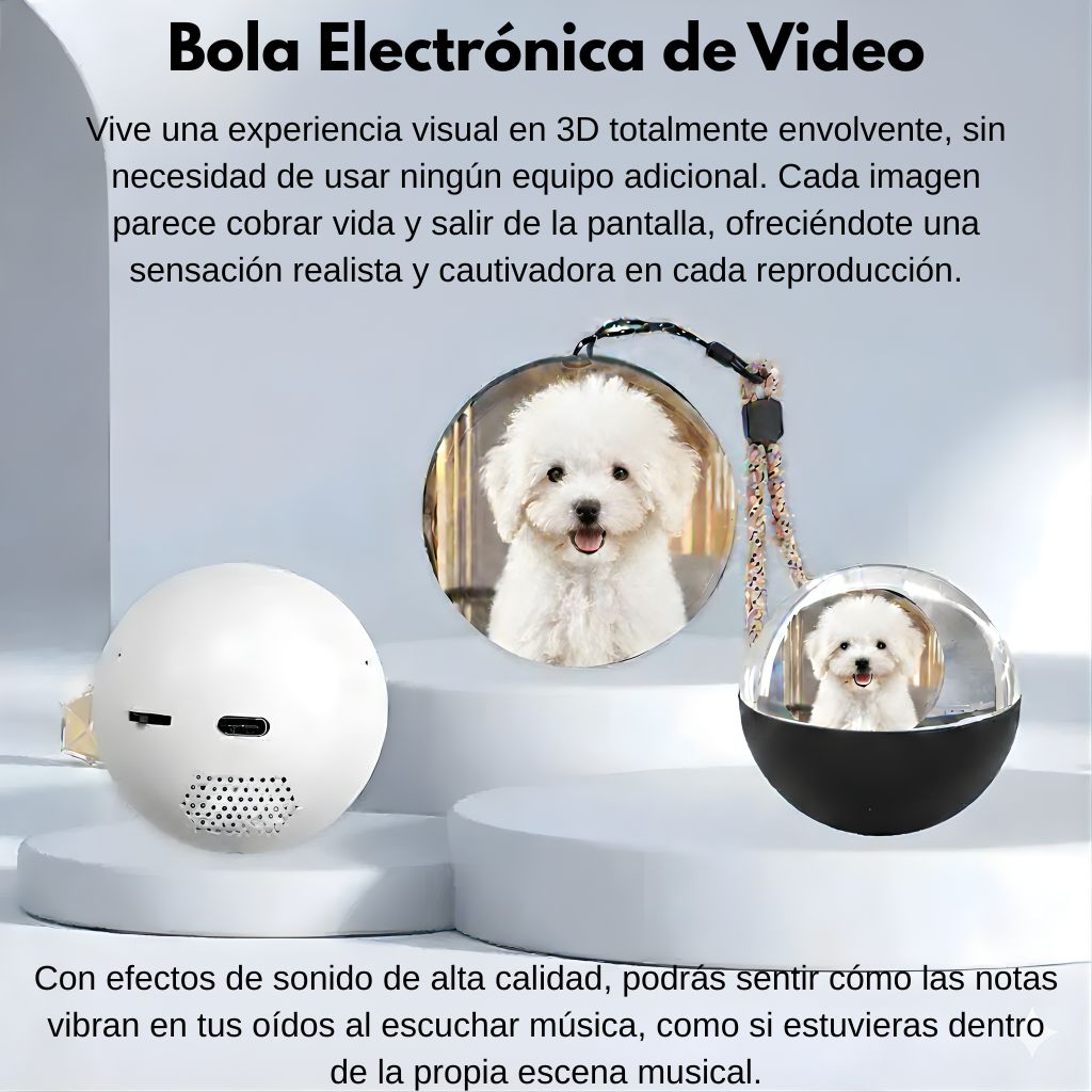 La Bola de Cristal Mágica 3D proyecta tus fotos y videos dentro de una esfera de cristal, creando un efecto tridimensional que hace que cada recuerdo cobre vida frente a tus ojos.