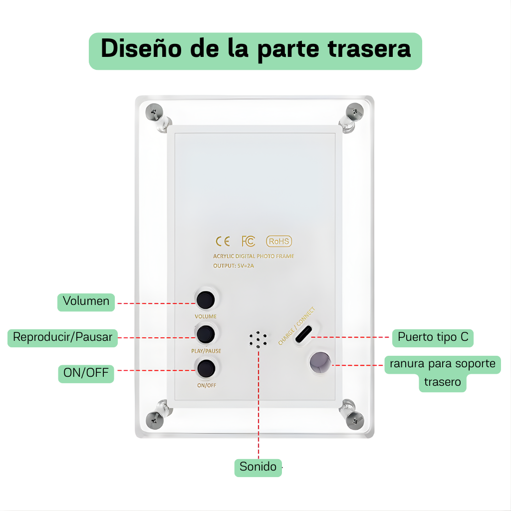 - Conexión rápida por USB Tipo-C: conecta el marco a tu ordenador (Windows/Mac) y arrastra tus archivos fácilmente.